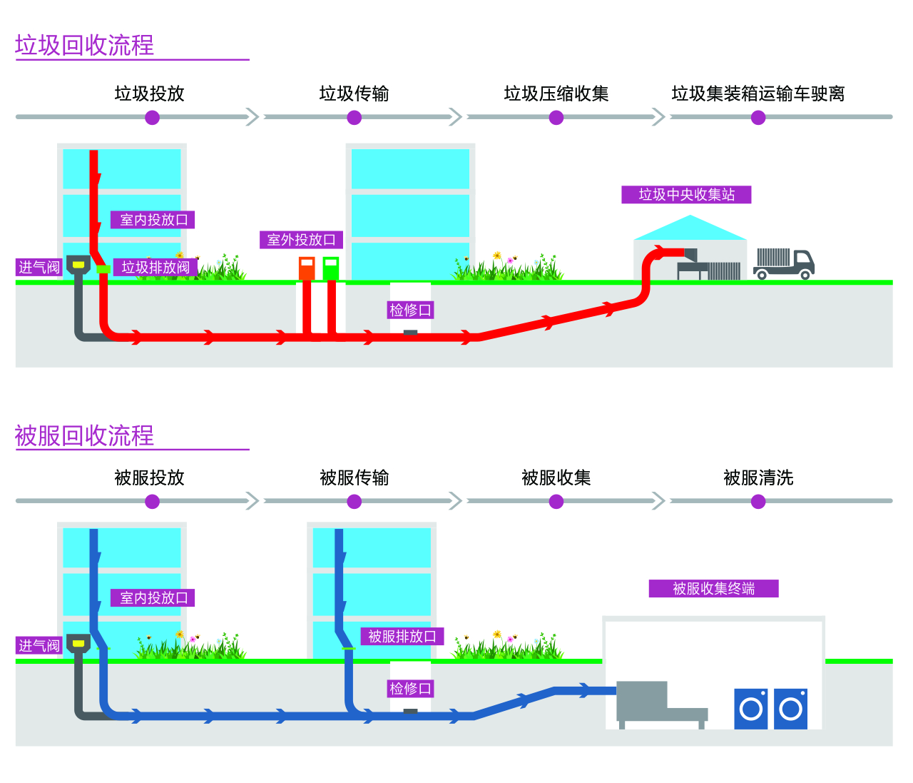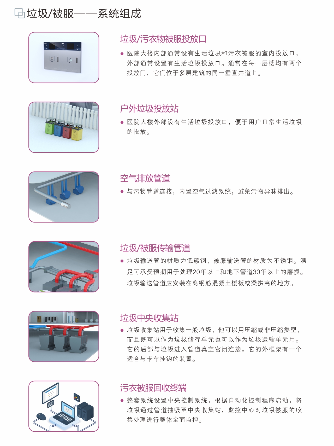 随着时代不断发展,传统的垃圾被服回收方式已经无法满足现代医院的需求,寻求更加智能化、自动化的垃圾被服回收解决方案已迫在眉睫。垃圾被服分类收集系统致力于解决传统垃圾被服处理中产生的交叉感染、二次污染、人工成本高、管理不到位等问题。安全环保:全流程封闭式传输,避免交叉感染,有效杜绝二次污染。成本节省:回收过程全自动化,无需人工参与,不占用电梯资源,较传统方式显著提高效率,大幅节省人力支出。管理提升:完善的回收解决方案,提升整体管理水平,优化流程,帮助构建现代化绿色医院。