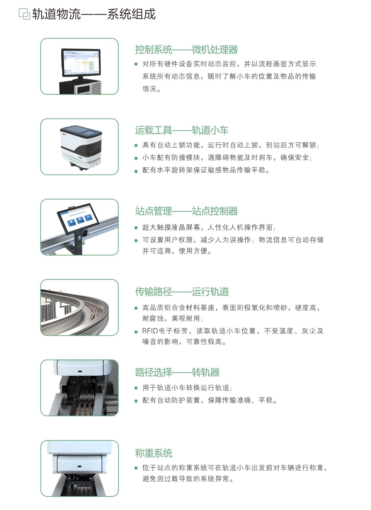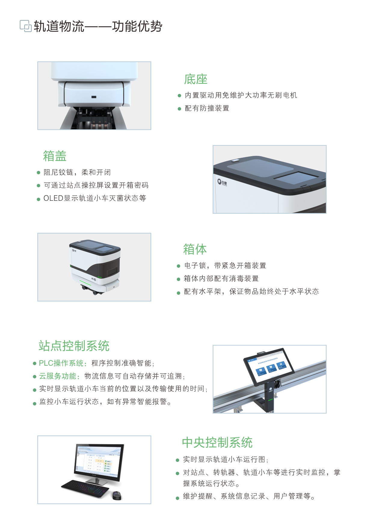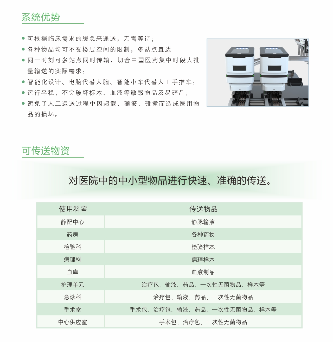 “轨道物流传输系统”是由计算机控制医疗物品综合传输系统,是通过特定的水平和垂直轨道设在医院各临床科室和各病区的物流传输站点,由装载小车沿着轨道实现临床科室、病区、医技科室和医院管理部门之间立体的、点到点的物品传输。